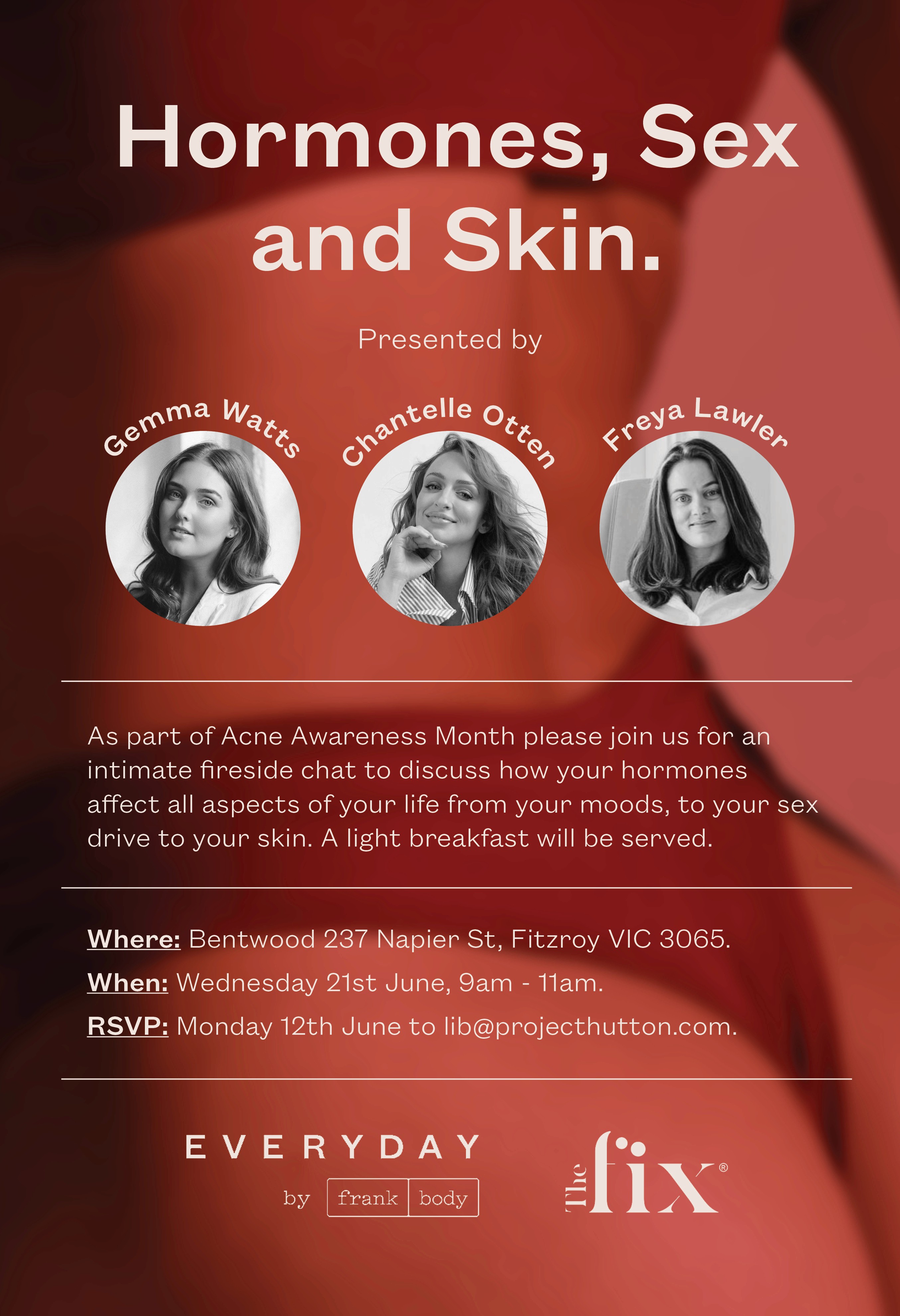 Design a series of touch points for Frank Body and The Fix’s collaboration event ‘Sex, Skin and Hormones’. The branding should be provocative in tone, whilst also suiting the venue.